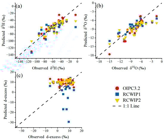 Scatterplots of the observed and predicted δ2H (a), δ18O (b), and d-excess (c) at each site of CHNIP.