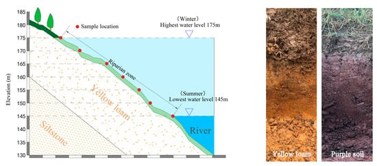 Schematic diagram of sampling locations in the Three Gorges Reservoir area (Left); photos of yellow loam and purple soil profiles (Right).
