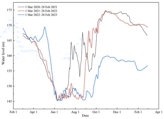 The Three Gorges Reservoir has adopted a “winter storage and summer discharge” regulation mode. The water level slowly rises from 145 m to 175 m beginning at the end of September each year. The rising process generally takes about 60 days, during which time the riparian zone and its vegetation are gradually submerged. The high water level of 170~175 m then persists for approximately 60 days. Water discharge begins in April of the following year, and the water level gradually drops from 175 m to 145 m, a process that typically takes 200 days. During this time, the riparian zone and its vegetation gradually emerge from the water. A low water level of 145~150 m persists for approximately 90 days. The variations in water level in the Three Gorges Reservoir riparian zone over the past three years are shown in Figure 3.