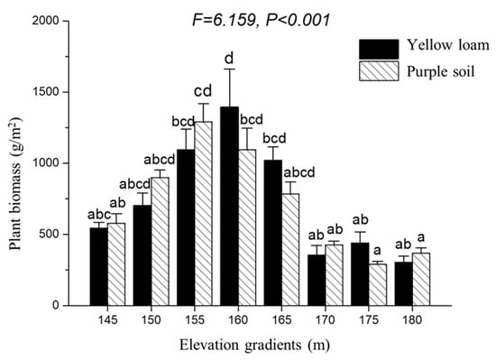 The plant biomass at different elevations in the riparian zone under the two soil types is shown in Figure 4. This indicated significant differences in the plant biomass at different elevations in the yellow loam and purple soil riparian zones (F = 6.159, p < 0.001), but the trend of plant biomass changes with water level elevation is consistent. That is, from an elevation of 145 m to 160 m, plant biomass increased with elevation. The plant biomass in yellow loam peaked at an elevation of 160 m to approximately 1395.40 g/cm2, whereas the biomass in purple soil peaked at an elevation of 155 m to approximately 1291.17 g/cm2. From an elevation of 165 m to 180 m, plant biomass showed a trend of decreasing.