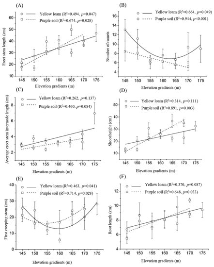 To maintain the C. dactylon community, it is important to address the morphological traits of this plant across a gradient of elevations, as well as its relationships with regional abiotic factors in the riparian zones. Hence, in this study, we tested the hypotheses that (1) C. dactylon morphological traits varied across elevations between two types of soil (yellow loam and purple soil) and (2) C. dactylon morphological traits varied with abiotic drivers.