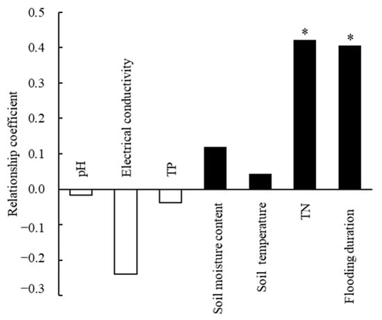 The relationships between plant biomass and environmental factors are shown in Figure 6. The biomass of plant C. dactylon in the Daning River was significantly positively correlated with soil total nitrogen content (R = 0.44, p < 0.05) and flood duration (R = 0.4, p < 0.05). Plant biomass also showed a positive correlation with soil moisture content and temperature. The biomass of plant C. dactylon was negatively correlated with soil pH, electrical conductivity, and total phosphorus.