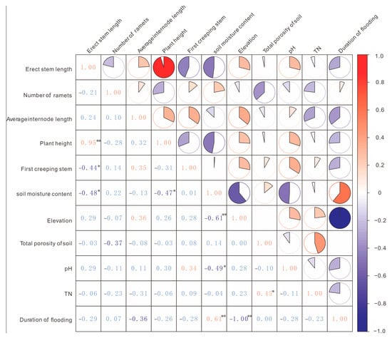 The Spearman’s rank correlation between the morphological characteristics of C. dactylon and soil environmental factors is shown in Figure 7. Results indicated a correlation between the morphological traits of C. dactylon and environmental factors. The plant height of C. dactylon was highly positively correlated with its upright stem length (R = 0.95, p < 0.001) and significantly negatively correlated with its first creeping stem length (R = −0.44, p < 0.05). The upright stem length (R = −0.48, p < 0.05) and plant height (R = −0.47, p < 0.05) of C. dactylon were significantly negatively correlated with soil moisture content.