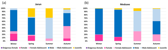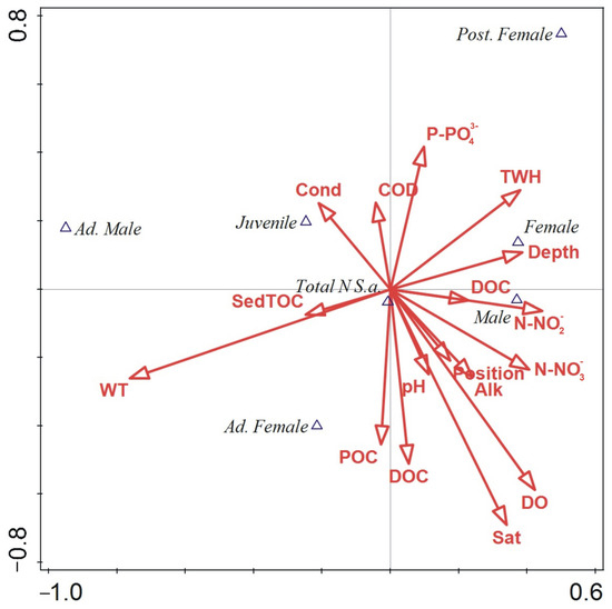 3.5. Relationship between Environmental Parameters and Gender/Ontogeny Classes’ Abundance
