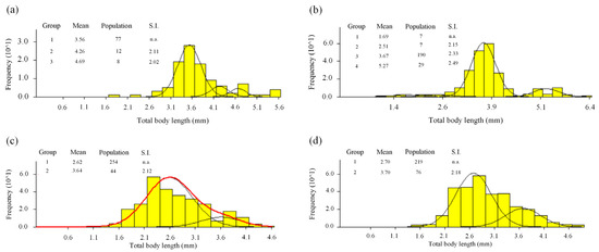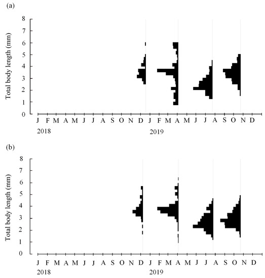 - Grant, A.; Morgan, P.J.; Olive, P.J.W. Use Made in Marine Ecology of Methods for Estimating Demographic Parameters from Size/Frequency Data. Mar. Biol. 1987, 95, 201–208. [Google Scholar] [CrossRef]