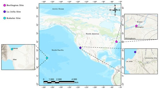 In this study, three stations with complete water level and meteorological data, namely Burlington, La Jolla, and Kahului, were selected from the topographic maps of the National Oceanic and Atmospheric Administration (NOAA) Tide and Current Data website (https://tidesandcurrents.noaa.gov/map/, accessed on 14 July 2023), with specific site locations shown in Figure 1.