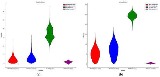 Violin analysis plots of meteorological (WS, WG, AT)—water level data for two stations, (a,b): Kahului and La Jolla stations, respectively.