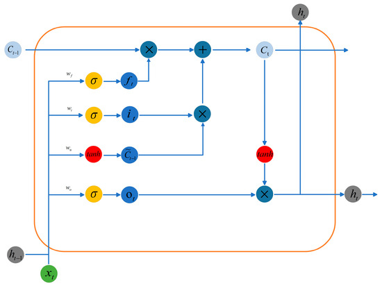 , , , and represent the weight matrices of the forgetting gate, input gate, update unit, and output gate, respectively, and , , , and epresent the bias terms in each of their equations, respectively. is the function of the sigmoid activation function in the LSTM, and tanh is the activation function in the update unit. The main difference between and the other three activation functions is the value range, sigmoid is [0,1], and is [−1,1], both used to control each link’s output. The basic cell structure of LSTM is shown in Figure 3.
