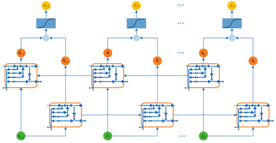 A bidirectional recurrent neural network (BRNN) is proposed by Schuster et al. [42], which can be trained only in the future frame of the predefined future frame without the restriction of using input information, and is implemented by simultaneous training in the positive and negative directions; good results are obtained in the experiments [42]. LSTM is a complex RNN model. BiLSTM can obtain both past and future information in many sequential tasks where this processing structure is needed. In contrast, the hidden state in LSTM cannot obtain future information. The basic idea of BiLSTM is that the forward and backward of each sequence are two independent hidden states, which are used to obtain the past and future information, respectively, and finally the two hidden states are summed to obtain the final output [43]. The hidden layers of each layer and the final output can be expressed as [44]:
