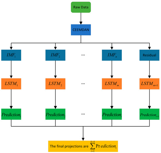 CEEMDAN-LSTM forecasting process; note that the LSTM part of it can be replaced with other models for the prediction task.