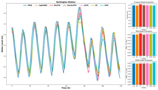 As shown in Table 5, the models have significant differences in predicting water levels in different areas under different combinations. Taking Burlington as an example, the performance of each model is analyzed in detail. Compared with SVM, RF, and XGB, models based on LSTM show better performance with the highest , lowest , , and , and the prediction accuracy in the order of magnitude is StackLSTM, BiLSTM, and LightGBM, SVM, RF, and XGBoost. In terms of input strategy, the highest progress was obtained in predicting water levels when all meteorological factors, WS, WD, WG, AT, Baro, and WL, were used as inputs, followed by WS, WD, WG, and WL combined inputs, AT, Baro, and WL combined inputs, and finally WS, AT, and WL combined inputs. From the experimental results, it is concluded that when more meteorological factors are used, it is more accurate for predicting water levels.