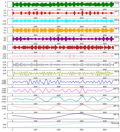 (6). Repeat Equations (17) and (18) until the residual component () no longer satisfies the decomposition condition and the decomposition stops. Finally, the original signal can be expressed as the following equation.