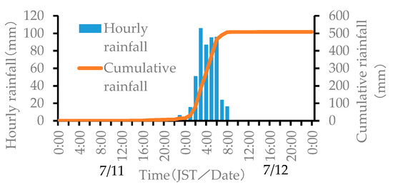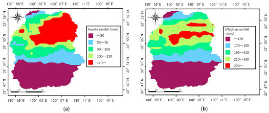 where is the effective rainfall at time t, is the hourly rainfall i hours ago, is the reduction coefficient i hours ago, and T represents the half-life. A 72-h half-life is used for the long-term effective rainfall to represent the long-term impact of rainfall, and a 1.5-h half-life is used for the short-term effective rainfall to represent the short-term impact of rainfall [61]. Additionally, Brand et al. [62] reported that most of the landslides that occurred in Hong Kong were caused by local short-term heavy rain, indicating a strong correlation between the short-term impact of rainfall and the occurrence of landslides. Therefore, in this study, the maximum one-hour rainfall (hereinafter referred to as hourly rainfall), which represents the short-term impact of rainfall, and the short-term effective rainfall (hereinafter referred to as effective rainfall) were adopted as explanatory variables for the trigger (Figure 7). The meteorological variables related to rainfall mentioned above were created using the 1 km mesh analyzed rainfall provided by the Japan Meteorological Agency [63]. The analyzed rainfall is an estimate of the amount of precipitation corrected by the observation values of meteorological radars using rain gauge observation values on an hourly basis. The analyzed rainfall considered was from 0:00 to 10:00 on July 12. The maximum one-hour rainfall and the effective rainfall were created as raster data using the interpolation tools of the ArcGIS spatial analyst, and an overlay was made with the SU data to calculate the maximum value for each SU dataset for analysis. The mesh size for the interpolation was set at 10 m (Table 1).