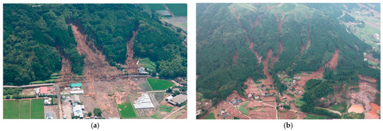 The landslides caused by heavy rain. (a) Shallow landslide that occurred in Ichinomiya Town, Aso City, Kumamoto Prefecture. (b) Debris flow that occurred in Kitanosaka-nashi, Ichinomiya Town, Aso City, Kumamoto Prefecture. The photos were provided by Asia Air Survey Co., Ltd.