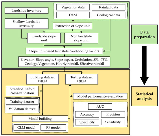 Shallow landslides are caused by various factors, such as topography, geology, and vegetation [1]. Among these factors, it has been reported that vegetation greatly influences the occurrence of shallow landslides [3]. Vegetation can enhance the stability of slopes by increasing soil strength through their root systems [4,5]. However, its effect is considered limited for failures occurring deeper than the root system [6]. The concept of utilizing the functions of ecosystems such as vegetation for disaster prevention and mitigation is known as ecosystem-based disaster risk reduction (Eco-DRR), and discussions towards its implementation have been held in recent years [7]. To reduce the risk of shallow landslides using vegetation, it is necessary to quantitatively assess the influence factors that vegetation has on shallow landslides. Broadly speaking, the methods to evaluate the influence of vegetation factors on shallow landslides can be divided into two categories: analytical methods using slope stability models and statistical methods using statistical analysis or machine learning.