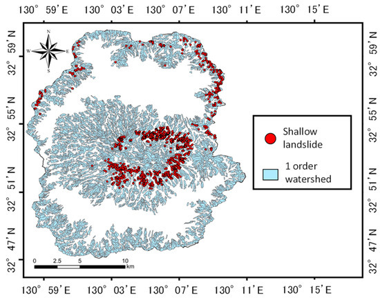 For the interpretation of landslide locations, we used the “Distribution Map of Sediment Movement Associated with the Heavy Rainfall in Northern Kyushu in July 2012” by the Disaster Prevention Research Institute [38]. In this study, we referred to the method by Asada et al. [39] for the interpretation of landslides and the extraction of shallow landslide data. First, a digital elevation model (DEM) based on laser profile (LP) data before and after the disaster was used. The difference in DEM values between before and after the disaster was calculated. The LP data before the disaster were acquired in 2010, while LP data after the disaster were acquired in 2013. The resolution of both DEMs is 1 m. Using the calculated difference values and aerial photographs, 2038 landslides were identified. Next, using the DEM before the disaster, the 1 order watershed areas were created using the hydrological analysis tools of ArcGIS spatial analyst. Finally, landslides within the 1 order watershed areas with an average depth of less than 2 m were defined as shallow landslides [39]. A total of 1347 shallow landslide areas were identified within the 1 order watershed areas. As a result, out of the 2038 landslides interpreted, the data of 1347 shallow landslides were extracted (Figure 5).