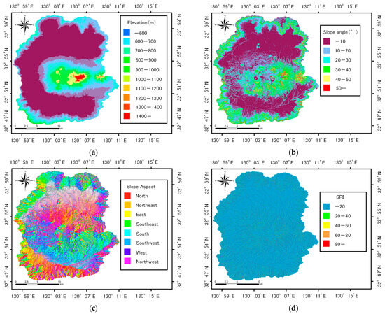 SPI represents the ease of sediment erosion and TWI represents the potential accumulation of groundwater [51], both of which are essential explanatory variables in assessing the risk of shallow landslides [44,45]. SPI and TWI are defined by the following formulas [51]: