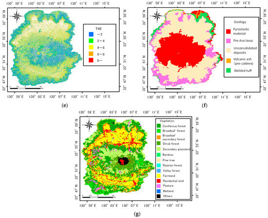 Primary factors: (a) elevation; (b) slope angle; (c) slope aspect; (d) stream power index (SPI); (e) topographic wetness index (TWI); (f) geology; (g) vegetation.