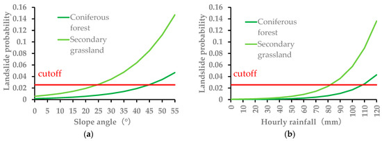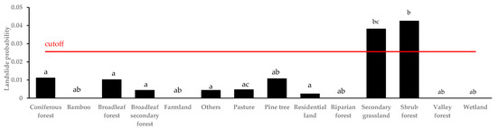 The landslide probability for each vegetation category was calculated based on the GLM. The landslide probability for each category was calculated by substituting the median value of the landslide units for the continuous variables such as elevation, slope, undulation, TWI, and hourly rainfall; the value of the reference regression coefficient (=0) for the categorical variables such as aspect, geology; and the regression coefficient for each vegetation category. Different English letters between categories indicate a significant difference at the 5% level according to the multiple comparison test (a < b). The red line indicates the cut-off value.