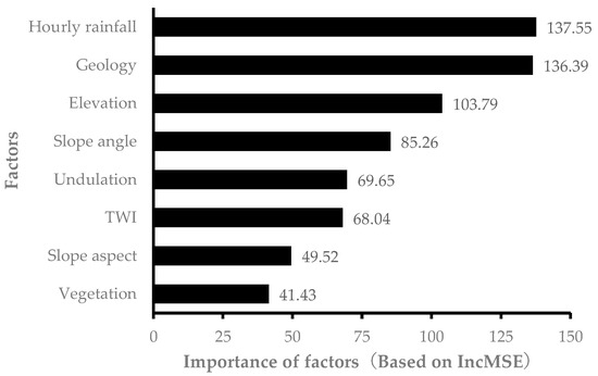 The hyperparameters for the RF model were determined using stratified 10-fold cross-validation, with ntree = 5000 and mtry = 3. Thus, a model was constructed with ntree = 5000 and mtry = 3, and the importance was calculated (Figure 9). Hourly rainfall had the highest importance, followed by geology, then elevation.