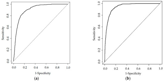 Receiver operating characteristic curves: (a) GLM; (b) RF model.
