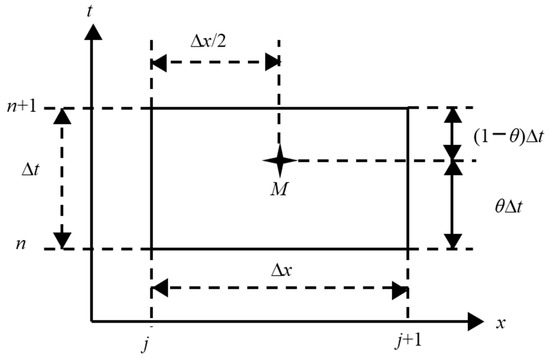 The above-mentioned Saint-Venant equations belong to the first-order quasi-linear hyperbolic partial differential equations. Generally, the analytical solution cannot be directly obtained, and the approximate solution can only be obtained by the numerical discrete method. After comprehensive comparison, this model uses the Preissmann four-point weighted implicit difference scheme with good stability, high calculation accuracy, and fast convergence speed to discretize the Saint-Venant equations [28] with the chase method [29]. The discrete grid form [30] is shown in Figure 1.
