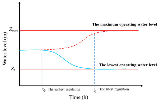 In this study, the channel hydrological simulation was carried out through the hydrodynamic model. The minimum and maximum operating water level of the single channel pond boundary composed of upstream control buildings and inner boundary control buildings in the study area were taken as the water level overrun threshold, and the water level overrun time was calculated by the model. When the upstream flow mutation occurs, to maintain the inflow and outflow balance of the canal pool, the downstream buildings must be regulated. Because the drainage pool flow wave transmission has a time lag, when the time is less than the flow downstream structure adjustment wave transmission time, it will inevitably produce buildings near the water level decrease, and the drainage pool is the lowest water level operation, so for the structure of the control time, there must be a minimum regulation time to ensure the water level after regulation or just close to the lowest water level operation. This is the earliest regulation time. When the regulation time of the downstream building is greater than the flow propagation time, the water level near the building must rise, and then, there is the highest operating water level in the channel pool. Therefore, there must be a maximum regulation time for the building to make the regulated water level just at or close to the highest operating water level, which is the latest regulation time. The time difference between the latest and the earliest regulation time is the safe regulation domain value. By calculating the earliest and latest regulation time, the safety regulation time range of the pump station can be obtained, which provides technical support for the actual operation of the project. The earliest and latest regulation times are shown in Figure 2.