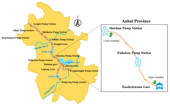The water diversion project from the Yangtze River to the Huaihe River has a large water flow, long lines, and a wide range. The Xiaohe branch line controls the intake gate to divert the water from the Yangtze River and Chaohu Lake from the Baishitian River mouth to the Paihekou pumping station. It is the key interval for the whole project to link the past and the future. This section is a newly excavated open channel. Affected by the topography, the hydraulic response of the canal pool is more obvious than in other canals, and this section involves the joint regulation and single-stage regulation of the gate pump group. The normal operation of the project is of great significance. Therefore, this section was selected as the research area in this study, and the control inlet gate of the Xiaohe branch line is used as the upstream control node, while the Shushan pumping station is the downstream control node. An overview of the canal section is shown in Figure 3.