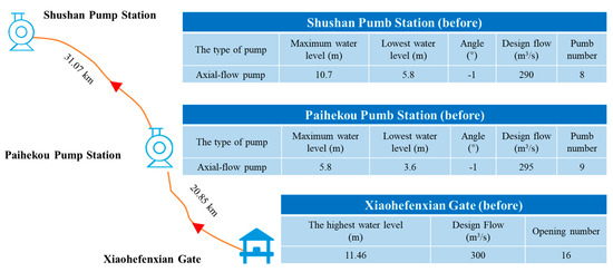 The design of the flood control level in front of the Xiaohe dividing line control inlet gate is 11.46 m; the designed water diversion level behind the gate is 6.0 m, and the bottom elevation is 0.6 m. The designed water level under the Shushan pumping station is 7.6 m; the lowest operating water level is 5.8 m, and the highest operating water level is 10.7 m. Paihekou pumping station has a single design flow rate of 37.69 m3/s and operates in 8 use modes and 1 standby mode, and the designed water level below the station is 4.1 m. The specific information is shown in Table 1 and Figure 4.