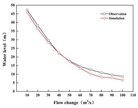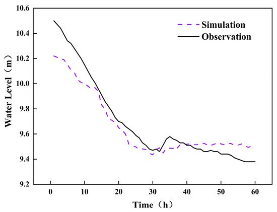 In order to test the simulation effect of the hydrodynamic model, a hydraulic model of the Shushan pumping station controlled by small joint and branch lines was constructed. The upstream flow through the sluice controlled by small joint and branch lines was used as the flow boundary; the downstream water level in front of the Shushan pumping station was selected as the water level boundary, and the measured water level of the Paihekou pumping station was used as the comparison to verify the accuracy of the model. Therefore, the output step size of the model was selected as 2 h/time; the simulation time was 60 h, and the roughness of the canal was the designed value of 0.015. The simulation results are shown in Figure 5.