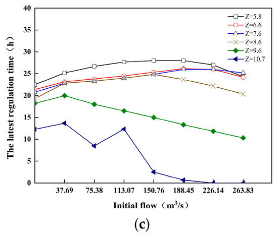 The result chart of the latest regulation time. (a) Initial flow of 0–113.07 m3/s. (b) Initial flow of 145.5–258.13 m3/s. (c) Relationship between downstream water level, initial flow, and latest regulation time for the same amount of flow change.
