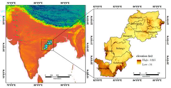 Odisha is located on the eastern coast of India, from 17.31° N to 22.31° N and from 81.31° E to 81.31° E. (Figure 1). The coastline of 485 km is connected to this state along with the Bay of Bengal. The temperature and humidity of this area are high, and the rainfall is moderate to low in nature, along with mild and brief winters. The climate in this state is tropical, 1451.2 mm of rainfall is the average of this state and rainfall primarily falls from June to September (Figure 2). Several climatic hazards, such as drought, cyclone and flooding, are very frequent in this state and occur every year in this state with varying severity. Five main divisions of physiography are correlated with this province, such as the Utkal plains, central plateaus, central mountains and highlands, western hills and floodplains. Mahanadi, Baitarani and Brahamni are the main rivers of this state which flow into the Bay of Bengal. About 3.47 percent of the population of India belongs to this state, which is 4.2 crores according to the Indian Census (2011). In the case of Odisha, the occurrence of drought is not a new phenomenon, and only the severity and extent of the drought varies from year to year [37]. Extreme drought happened for the first time in Odisha in the year 1866, accompanied by several droughts of mild to severe magnitude, and occurred 17 times so far. This means that there has been a serious drought in Odisha roughly every 8 years. The drought in 2000 and 2001 was the most severe occurrence, along with the other years of drought in 1866, 1919 and 1965. Essentially, the western portion of Odisha is synonymous with drought and the southern central part is also comfortable with drought.