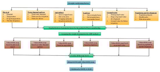 Parameters were considered for this study after analysing some of the previous literature and after checking the reliability and suitability of databases for drought [38]. After analysing some of the previous literature, the test of the efficiency and suitability of the drought databases considered the conditions for this analysis [38]. After that, the spatial layers were formed for each parameter. Under six groups, 22 spatial layers with a resolution of 30 m were created. The method was considered in this analysis for the classification of maps [39]. ArcGIS was used for the mapping of the vulnerability map of the drought in an effective way. The definitions of the other parameters are given in detail below.
