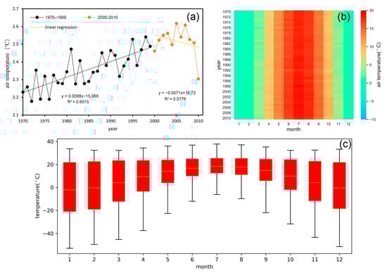As shown in Figure 1b,c, compared with the significant increasing trend of annual mean air temperature, the variation pattern of monthly air temperature at a global scale was relatively stable during the period 1970–2010, which began to consistently increase in February, reached the highest point in July, and began to decline in August. The high-temperature months were concentrated in May to September, while the low-temperature months were concentrated in November to February. In addition, the global air temperature from November to February showed a larger variation range than that from June to August, indicating a more significant response of low temperature to climate warming.