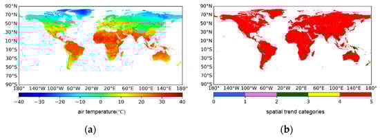 Spatial characteristics of global air temperature from 1970 to 2010: (a) distribution of multi-year average air temperature, and (b) spatial variation trend characterized by the Mann–Kendall (M–K) test. Colors correspond to the specific variation trends defined in Table 1.