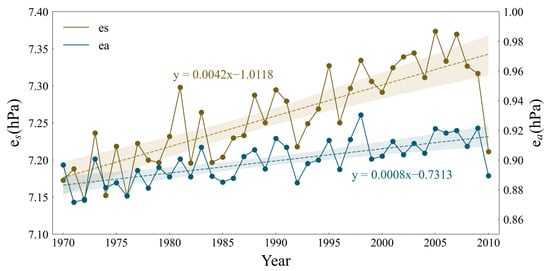 Intra-annual variation of global vapor pressure, and actual water pressure, , from 1970 to 2010. The shaded area represents the 95% confidence interval for the linear fit. The dotted line is the regression line.