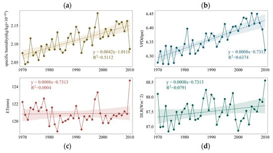 As shown in Figure 4b, the global annual average VPD exhibited an upward trend from 1970 to 2010, increasing at a rate of 0.003 hpa/a. Similar to specific humidity, changes in VPD showed good synchronization with those of global air temperature. This phenomenon was also noted by Yuan et al. (2019) [47]. However, the global annual average ET increased slightly (Figure 4c), which might be attributed to the trade-off between the increasing ET from 1982 to 1997 and the decreasing ET since 1998 [56]. In addition, an increase in the VPD often means an increase in water vapor lost to the atmosphere through plant transpiration and soil evaporation. From the comparison of global VPD and ET (Figure 4b,c), it was found that the increase in the global average VPD did not lead to significant changes in ET, implying that plants can perceive the drying air and close their stomata to prevent water loss [57]. As shown in Figure 4d, the global annual average DLR from the surface showed an increasing trend from 1970 to 2010, at a rate of 0.0096 W∙m−2/a. It is noteworthy that DLR values showed consistent and positive correlations with the annual average temperature and specific humidity. This is consistent with the conclusions in the research of Christian et al. [58].