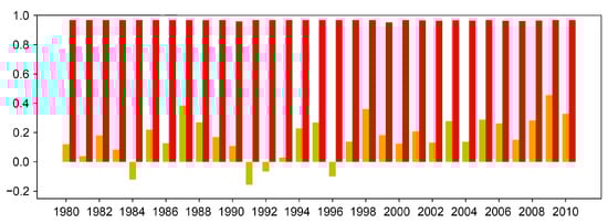 The M–K nonparametric test was adopted in this study to analyze the variation trend of the global average air temperature from 1970 to 2010. The results are shown in Figure 2b. The variation trend of the global air temperature was divided into five types, as shown in Table 1. More than 95% of the world’s land surface air temperature showed an upward trend (significant warming and slight warming). This finding is consistent with the conclusion obtained by Ma et al. using the M–K test on data of the US National Climate Data Center [53], and essentially consistent with the general background of global warming analyzed by the linear regression model in Section 3.1. However, there are also spatial differences in global warming. As can be seen from Figure 2b, about 2% of the world’s land surface showed a downward trend (significant cooling and slight cooling), mainly in northwestern Australia and South America, in places such as Bolivia and Argentina, which is consistent with the research results of Ji et al. [54]. They found that certain areas tend to become colder in the context of global warming, such as the Andes in the southern equatorial region.