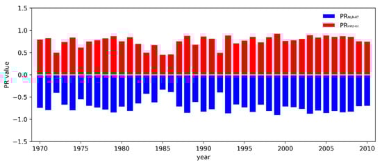 As shown in Figure 7, the partial correlation coefficient between air temperature and VPD and NLR from 1970 to 2010 shows maintenance of a good complementary relationship, i.e., the coefficient between VPD and air temperature increased, while the coefficient between NLR and air temperature decreased, and vice versa. Accordingly, Figure 8 shows that PRNLR–AT and PRVPD–AT had a strongly negative correlation (r = −0.999), which further verifies the complementary relationship between NLR and water vapor. This complementary relationship has also been regionally verified.