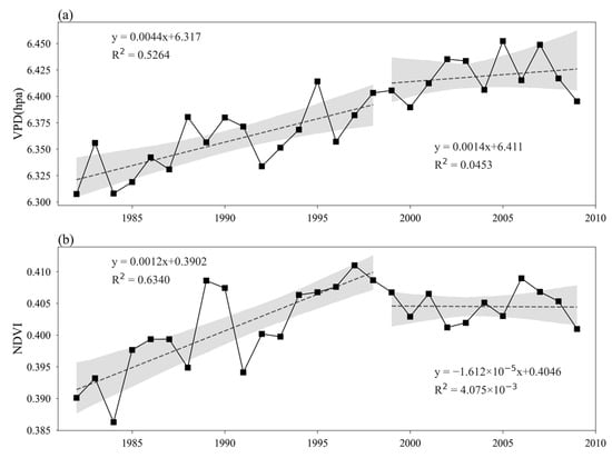 Annual variations in (a) VPD and (b) NDVI from 1982 to 2009. The shaded area represents the 95% confidence interval for the linear fit. The dotted line is the regression line.