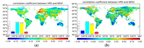 Spatial distribution of the Pearson correlation coefficients between NDVI and VPD: (a) from 1982 to 1998 and (b) from 1999 to 2009.