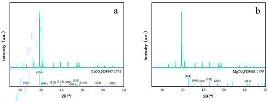 Diffractogram of (a) calcite CaCO3 and (b) magnesite MgCO3 in limestone determined using X-ray diffractometer.