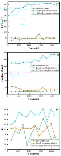 Figure 3 depicts the hydrochemical properties of limestone reacted in three separate reaction systems for 12 days, including total alkalinity (HCO3− concentration); conductivity; pH; and solution Ca2+, Mg2+, and phosphate concentrations. Because the water used for the tests was deionized, there was theoretically no SO42− and NO3− in the solution. It was measured to guarantee the rigor of the experiments, and no SO42− or NO3− were found in the solution. Figure 3a,b show the total alkalinity and conductivity, respectively, and it was discovered that in 100 mg/L phosphate solution, the conductivity increased from 446 μS/cm to 572 μS/cm initially, which increased with the increase in total alkalinity, whereas in the 2 mg/L phosphate solution, both were in the dynamic equilibrium state. By comparison, the conductivity and total alkalinity in the 100 mg/L phosphate solution were higher than in the experimental and control groups of the 2 mg/L phosphate solution, and more ions were displaced out of the solution, indicating that the high phosphate concentration could accelerate the dissolving action of the limestone. The major component of limestone is CaCO3, which is a slightly soluble salt that forms carbonate ions when it comes into contact with water; in the experiment, KH2PO4 produces phosphoric acid and potassium hydroxide when it comes into contact with water, and phosphoric acid ionizes in water to produce phosphate ions, both of which can react with hydrogen ions to make the solution appear alkaline []. The pH in all three experimental groups was more than 7, as seen in Figure 3c.