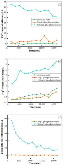 The concentrations of Ca2+, Mg2+, and phosphate ions in the 100 mg/L phosphate solution were higher than those in the other two experimental groups, as shown in Figure 3d–f, with the Ca2+ concentration changing from 42.86 mg/L to 30.59 mg/L and the phosphate ions concentration changing from 94.122 mg/L to 15.223 mg/L, with both showing a decreasing trend because of the simultaneous presence of CO32− and H2PO4− in the solution, which reacted to form HCO3− and HPO42−. Precipitation of CaHPO4 occurred as the solution alkalinity increased, eliminating phosphate and Ca2+ from the solution, which is in agreement with the findings of Song Y et al. []. The increase in Mg2+ concentration may be due to the fact that Ca2+ is more active than Mg2+, and phosphate is preferentially adsorbed on Ca sites [], which results in more and more of the produced Mg2+ being retained in the solution due to an incomplete reaction. At the same time, the increase in alkalinity may interfere with the activity of other components in the solution, so the concentration of Ca2+ in the 2 mg/L phosphate solution was higher than that of the deionized water solution, but the concentration of Mg2+ was lower, which means this phenomenon could be linked to the highly hydrated ion Mg2+, which will cause a change in the solution’s hydration effect at the limestone–water interface [].