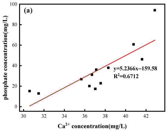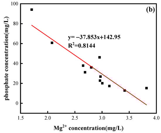 The correlation between Ca2+, Mg2+, and phosphate during the 12 d of the limestone reaction in the phosphate solution was examined in this work to better clarify the dissolving adsorption of limestone in the phosphate solution, as shown in Figure 4. The outcomes demonstrated a positive association between Ca2+ and phosphate in a 100 mg/L phosphate solution, with a correlation value of R2 = 0.6712; Mg2+ and phosphate had a negative connection, with an R2 value of 0.8144. As a result, Ca2+ had the greatest influence on the experimental adsorption process, while Mg2+ had the smallest impact. In the 2 mg/L phosphate solution, due to the concentration of the solution being lower, Ca2+, Mg2+, and phosphate had no obvious correlation, so they were not analyzed.