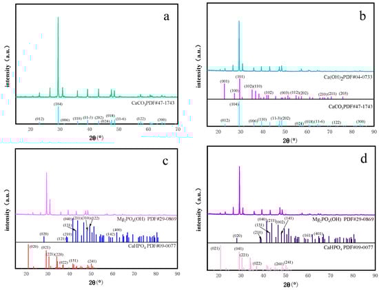 In order to further understand the nature of the limestone surface sediments, their structure was analyzed using XRD, and the X-ray diffraction patterns of original limestone samples dissolved in various solutions are shown in Figure 5. The changes in mineral species were detected using XRD in four experimental groups (a: initial sample of limestone, b: deionized water solution, c: 2 mg/L phosphate solution, d: 100 mg/L phosphate solution). This showed that limestone powder was dominated by strong peaks of CaCO3, and the initial sample of limestone powder contained a small amount of MgCO3; in the deionized water solution, the 2θ located at 18.15°, 28.75°, 34.15°, 47.17°, and 50.85° belong to the (001), (100), (101), (102), and (110) facets of Ca(OH)2 (PDF#04-0733), in addition to which a small number of weakly diffracted peaks about Ca(OH)2 appear. This suggests that CaCO3 in limestone and deionized water underwent a water–rock reaction to create Ca(OH)2, and a tiny quantity of CO2 was created in the process to ionize bicarbonate ions after the calcium carbonate was dissolved in water, which confirms that the pH was greater than 7 in all reactions and that the solution was basic.