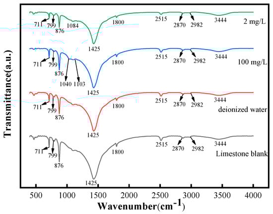 Fourier infrared spectroscopy was employed in this experiment to investigate and confirm the limestone samples and the functional groups formed by their dissolution in various solutions. As shown in Figure 6, it can be observed that there are two sharp peaks at 711 cm−1 and 876 cm−1, and a wider transmission band was found at 1425 cm−1, which corresponds to the υ4 (in-plane bending vibration), υ2 (out-of-plane bending vibration), and υ3 (asymmetric stretching) absorption bands [,], confirming the presence of CaCO3, the most dominant minerals in limestone [], and that the signal of the 1425 cm−1 adsorption vibration band is less the higher the phosphate content. Meanwhile, phosphate vibrations were also detected between 1040 cm−1 and 1103 cm−1 [,], with the υ3 (asymmetric stretching) mode being more significant in the experimental group with higher phosphate concentrations, demonstrating the efficiency of phosphate adsorption by limestone [] and the production of calcium hydroxyphosphate []. The existence of a weak vibrational band between 2870 cm−1 and 2982 cm−1 and a bending band close to 3444 cm−1, both associated with stretching of the O-H bond [], confirmed the XRD findings.