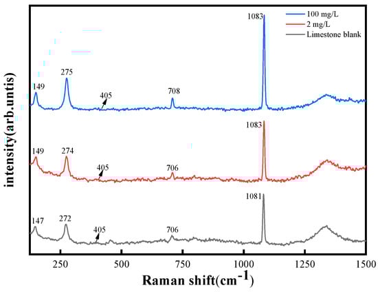 In this experiment, the limestone’s Raman spectra were examined in order to further validate the FTIR results (for more information, see Figure 7), because carbonates have six vibrational modes consisting of two external modes (translational T and rotational L) and four internal modes []. According to the findings, the internal modes of the CO32− υ4 symmetric deformation and υ1 stretching vibration are found at 706 cm−1 and 1081 cm−1 for the Raman activity spectrum bands of limestone, respectively [], and external vibrational modes (translational T and rotational L) involving relative translation and vibration of metals (Ca2+ or Mg2+) are present in the Raman activity spectra between 149 cm−1 and 275 cm−1 []. As evidence of the presence of Ca2+ or Mg2+ activity on the limestone, the strength of the two external T and L modes was seen to increase sequentially from the original limestone to the low- to high-concentration experimental group, with the trend being the more concentrated the experimental solution, the greater the Ca2+ and Mg2+ activity []. It was discovered that the Raman shifts were gradually biased towards short waves in these bands of 149 cm−1, 275 cm−1, 708 cm−1, and 1083 cm−1, observed from high concentration to low concentration and then to the initial limestone. A small peak appeared at 405 cm−1, which may be a feature of the Ca-P phase [,].