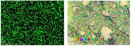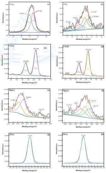 The high-resolution Mg1s XPS maps were deconvolved, as shown in Figure 8e,f, and it was discovered that three distinctive peaks appeared in the 100 mg/L experimental group, of which 1304.8 eV was attributed to Mg(OH)2 and 1303.88 eV to MgO []. It was speculated from the findings of the XRD analysis that 1300.25 eV might be related to the Mg-P compounds; four distinctive peaks observed in the 2 mg/L experimental group, of which 1037.15 eV was assigned to Mg2PO4(OH) [], 1035 eV to MgCO3 [], 1304.25 eV to Mg(OH)2, and 1303.57 eV to MgO []. These findings indicate that Mg-P compounds moved to the region of higher binding energy at lower Mg concentrations, whereas other Mg-containing compounds’ binding energies increased as the Mg concentration increased, suggesting that Mg2+ interacted with phosphates and other carriers [].