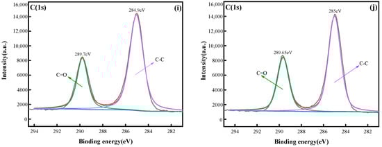 Figure 8i,j show the high-resolution C1s XPS spectra of limestone from various experimental groups. The characteristic peaks of the 100 mg/L experimental group were located at 289.7 eV and 284.9 eV, and those of the 2 mg/L experimental group were located at 289.65 eV and 285 eV, which were attributed to the carbonate (CO32−) [] and C-C single bond [], respectively. The binding energies of C1s did not differ considerably between the two experimental groups, but with the ligand exchange mechanism between carbonate and phosphate ions [], the peak of carbonate (CO32−) was weakened due to the increased phosphate content on the adsorbent surface, whereas the C-C peak did not change appreciably.